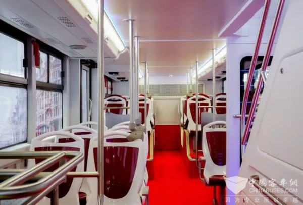 本次进阶的第四代纯电动敞篷双层观光巴士E12S,外观采用E系列新前脸,搭配典雅灯具与电镀饰件,更具科技感;整车通过轴距加长与底盘优化,实现上层50座、下层22+1座的宽敞布局。驾驶区配备一体化可调节平台与10.1英寸智能大屏,操作便捷;乘客区设有USB充电口、多国语音导览及无障碍设施,提升舒适与人性化体验。