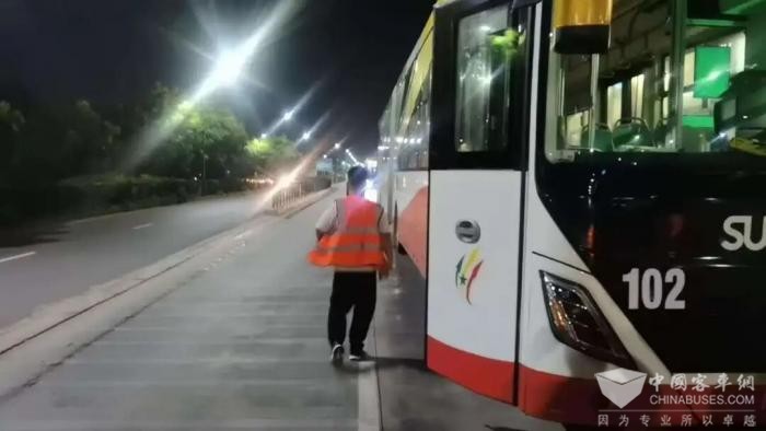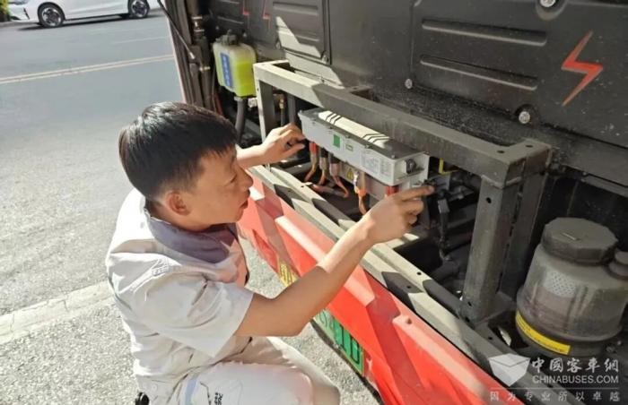 李观顺顶着高温湿热天气,坚守在车辆运营一线,细致检查电池与电控系统,确保新能源车辆在特殊气候下的稳定运行,守护旅客的每一段旅程。