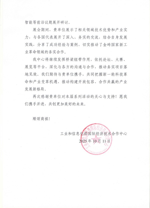 金龙收到工业和信息化部国际经济技术合作中心感谢信