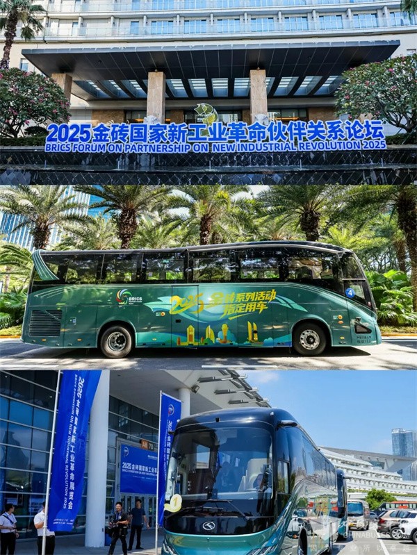 在2025年9月16日至17日金砖国家新工业革命伙伴关系论坛期间,金龙选派5台MC数智大巴担任指定外宾接驳用车。作为高端商务接待标杆车型,金龙以融合中华美学与前沿技术的产品实力,搭配航空级服务标准,为金砖国家重要嘉宾打造安全、舒适、尊贵的出行体验。