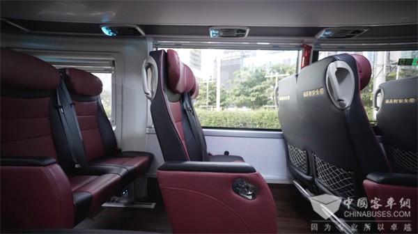 除了静音,乘车舒适度更是核心考量。此次引入的海格新V系采用12米车长的最高端车型,在此基础上,车辆还进行了诸多个性化优化与选配。最直观的便是座位配置——在12米的车身内,座位数量被控制在40-44个,相比传统大巴大幅减少,为游客提供了更宽敞的乘坐空间。同时,车上配备的均为商务座椅,可实现45度角倾斜,搭配可调节头枕,让游客在旅途中能够轻松休息,缓解疲劳。