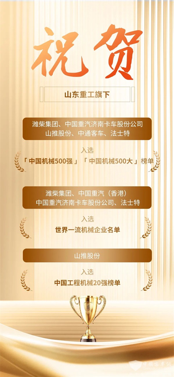 2025年12月4日,由中国机械工业企业管理协会主办的“2025年中国机械500强”研究报告发布会在江苏苏州召开。山东重工旗下潍柴集团、中国重汽济南卡车股份公司、山推股份、中通客车、法士特五家企业集体荣登“2025中国机械500强”、“2025中国机械500大”榜单。其中,潍柴集团、中国重汽(香港)、中国重汽济南卡车股份公司、法士特入选“2025世界一流机械企业”名单,山推股份入选“2025中国工程机械20强”榜单。