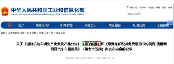 2025年6月20日,工信部发布关于《道路机动车辆生产企业及产品公告》(第396批公告,下也称“本批次公告”),这是2025年以来工信部发布的第6个批次的汽车新车产品公告。