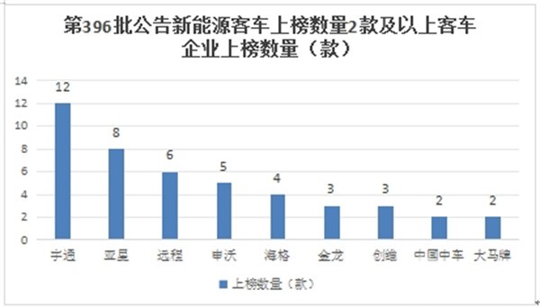 在第396批公告中有多个客车品牌企业参与了新能源客车新品申报,各个品牌上榜数量统计如下:上榜数量在2款及以上的车企品牌统计如下: