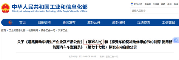 2025年8月8日,工信部发布关于《道路机动车辆生产企业及产品公告》(第398批公告,下也称”本批次公告”),这是2025年以来工信部发布的第8个批次的新车产品公告,也是2025年下半年的第二批公告。