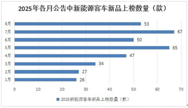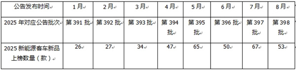 上图表显示,2025年8月工信部发布的第398批公告中,上榜新能源客车新品53款,居今年以来各月第三。在这本属于淡季的8月份,新能源客车上榜数量还能排第三,这或许意味着今年下半年我国新能源客车可能将迎来新的一轮增长。据分析主要得益于2025老旧新能源公交车淘汰更新补贴政策的全面落实和进一步落地执行。