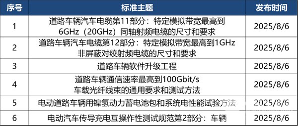 2025年8月共有新立项标准法规6部,涉及线缆、电池、软件等。详情如下: