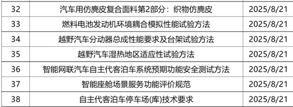 2025年8月共计发布征求意见稿38部,主要涉及智能网联、零部件、工艺、专用车等。详情如下: