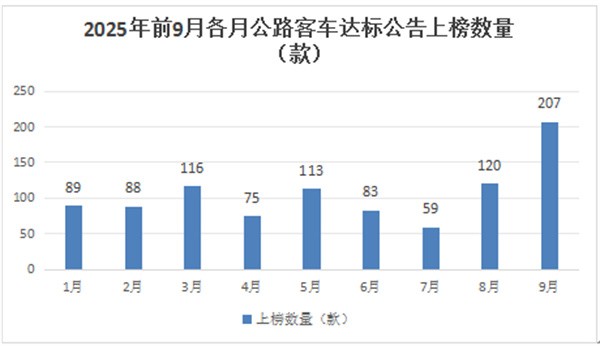 根据交通部数据,2025年1-9月各月(分别依次对应第372批---第380批)公路客车达标车型公告上榜数量统计如下: