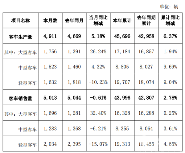 上表可见,金龙汽车生产各类车辆4911辆,同比增长5.18%;销售各类客车5013辆,同比微降0.61%。其中,大型车生产1756辆,同比增长26.24%,销售1696辆,同比增长32.4%;中型车生产1523辆,同比增长4.32%,销售1283辆,同比下降6.21%;轻型客车生产1632辆,同比下降10.23%,销售2034辆,同比下降15.07%。