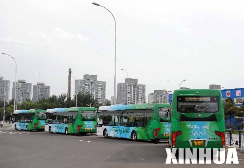7月17日,奥运电动公交客车停放在奥林匹克南公交场站内。据介绍,从7月20日起,50辆由我国自主研发的零排放电动公交客车组成的奥运电动车队将在奥运中心区分5条线路运营,为参加北京奥运会和残奥会的媒体、运动员和技术官员服务。新华社记者罗晓光摄