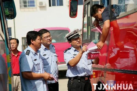 8月23日,天津公安宁河分局交警支队交警和宁河县交通局、安监局人员一起向司机和乘客宣讲公路客运交通安全知识。