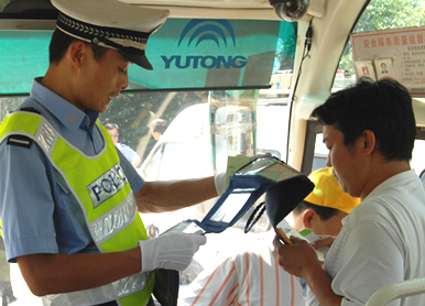 为了预防重特大道路交通事故,市交管支队在旅游高峰即将到来之际,在全市范围开展公路客运交通安全宣传和整治活动。严查公路营运客车经营及驾驶人员的相关资质,以及各种客运车辆交通违法行为,为广大游客旅游和市民出行创造良好的交通环境。图为 民警检查客运车辆的经营手续。