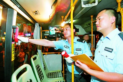 2009年6月14日9时,记者跟随检查小组前往火车站。在12路公交车上,检查人员认真检查公交车发动机、灭火器等情况,因为12路公交车为普通公交车,检查人员还着重试用了前后门的手动开关;在312路高等级公交车上,检查人员特别“关注”车上有没有配备逃生锤。长沙市客管处透露,检查发现几乎所有高等级公交车的逃生锤都有过被“拿走”的遭遇。