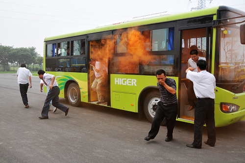 9:30,第一种模拟演练正式开始,一辆公交车在营运途中忽然有物品“燃烧”,冒出大量浓烟,顿时让车内“伸手不见五指”,车内有三十位乘客,情况十分危急……驾驶该车的司机在“着火”后立即把车停住并打开车门,同时引导乘客下车,乘客捂着鼻子由前后门匆匆逃生。随后,司机用车上的灭火器进行灭火,逃出的乘客紧接着拨打119、120说明了事件地点进行求助,20秒后车内驾乘人员全部撤离到安全地点。