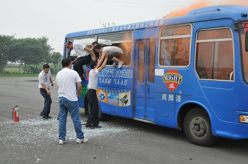 公交客运车辆应急演练现场分两种模拟场景进行演练,一种是模拟公交车车门能正常打开,乘客从车门逃生,另一种是汽车车门无法正常打开,司机引导车内乘客用车上救生锤敲破车窗玻璃,协助乘客从玻璃窗撤离逃生。