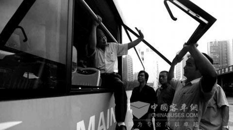 2009年8月11日,记者在南头车队看见了这款新车。记者看到,新款大巴车在外观上与普通车没有太大差异,而在车内两侧单座的第一排的大玻璃旁安有一个红色的把手。玻璃本身和普通玻璃没有区别,但车窗上有明显的标注“紧急情况时可旋转打开透明罩盖,旋转红色手柄向车外推开安全窗”。公汽公司的工作人员为记者演示了安全逃生窗的使用。记者看到工作人员旋转手柄后向外推开车窗,“但车窗一般不能超过90度,超过后就会自动脱落”。