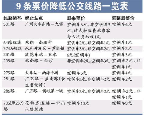 第三是广佛同城化,随着广佛年票互通互认、公路客运附加费及运输管理费取消,相关公交线路的票价也应该相应适度调整降低。这方面的公交线路共计6条,具体包括231路、205路、275路、281路、286路以及705路(原先编号为237路)等。