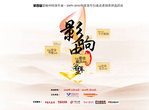 “第四届影响中国客车业•2009-2010年度客车行业读者调查评选活动”将于2010年1月18日正式截止,届时将在评选活动专家委员会各位专家顾问的监督指导下进行投票统计,最终评选出有效得票数最高的终极大奖!在剩下的短短12天时间里,结果仍然是未知数。究竟鹿死谁手,让我们拭目以待。