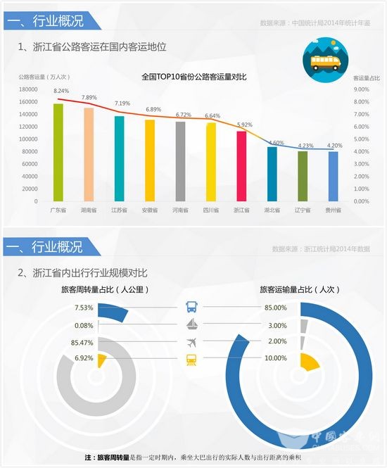 据国家统计局2014年数据显示,浙江省公路客运量在全国34个省份和直辖市中排名第七,占全国的5.92%。这与浙江省外来人口流动性大、旅游产业发达密切相关。