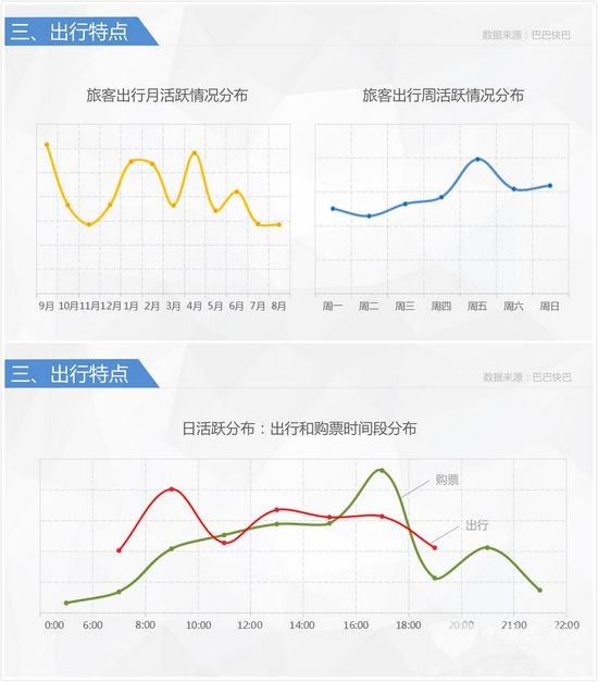 月活跃度:无论季节、天气,都无法抵挡出行的脚步。乘坐大巴出行的时间主要集中在每年9月,不难解释,开学啦,学生党乖乖返校涨知识!当然,春运回家过年,也是永恒的主题。还有踏青季节,春光大好,假期连连,大家都争抢着出门浪去了!