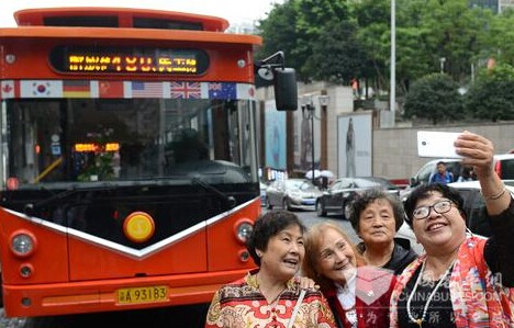 “这个公交车坐起好舒服,座椅像飞机上的那种,安逸!”“居然车上还有饮水机、桌子啊!洋气!”2016年10月9日下午,在重庆渝中区解放碑国泰广场旁的480观光旅游观光巴士上,不时传来老人们的阵阵赞叹声。