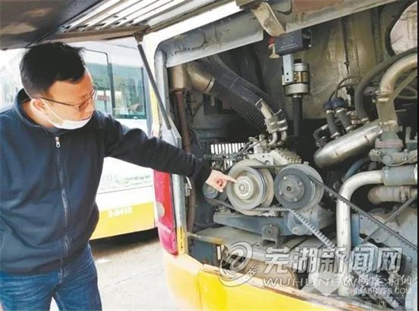 当日,在该首末站,记者见到了芜湖公交四分公司恽副经理。他和1路公交车队长傅吉桂打开了一辆停在车场的公交车车尾发动机仓盖,向记者进行了讲解演示。原来,发动机仓内大致可见到3部分,左边为车载空调压缩机、中间为发动机,右边是带风扇的水箱。恽副经理指着空调压缩机告诉记者:“虽然车载空调防疫以来均未使用,但是它的动力皮带和发动机还是相连,发动机在工作时,这个动力皮带就会带动过渡轮转动,不过空调没有打开的情况下就是空转,当天2路车出问题的地方就是这个过渡轮轴承坏死无法转动,导致这条动力皮带摩擦过度,最终磨断,这一过程中不断磨碎的皮带粉末被风扇吹到仓外,看起来在冒黑烟,事实上这种传动皮带一般不会起火,而空调压缩机与发动机相对独立,也没有油路经过,不会发生滴漏油导致起火。”