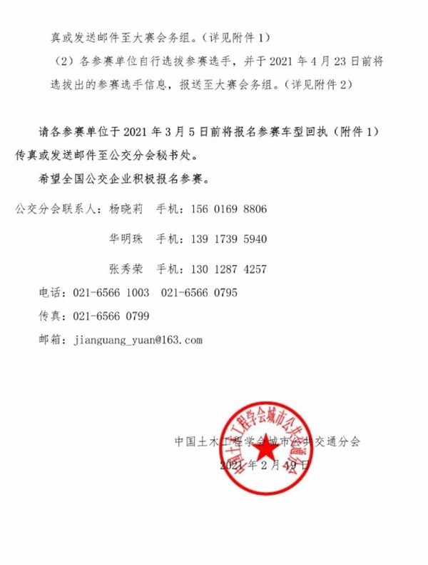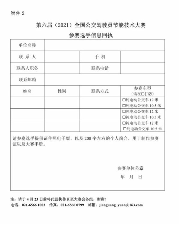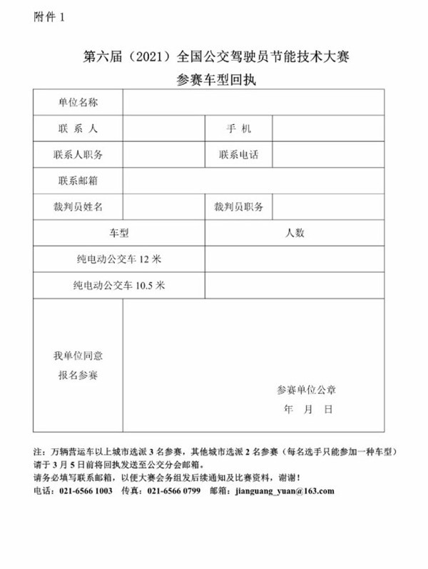 请各参赛单位于2021年3月5日前将报名参赛车型回执(附件1)传真或发送邮件至公交分会秘书处。希望全国公交企业积极报名参赛。