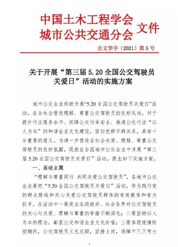 “理解与尊重同行共同关爱公交驾驶员”。各城市公交企业要把“5.20全国公交驾驶员关爱日”活动,作为践行党的群众路线和关心关爱公交驾驶员群体的有效载体和有力抓手。在活动中一要突出各级政府、社会各界对公交驾驶员的关心与关爱、理解与尊重的举措不断深化;二要坚持以人为本的理念,彰显公交和谐企业文化价值;三要体现疫情防控期间,公交驾驶员义无反顾,坚持上岗,保障市民正常出行的奉献精神;四要反映关心关爱公交驾驶员身心健康的共识与成功经验。