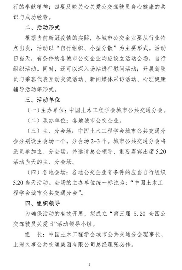 (一)今年的“5.20全国公交驾驶员关爱日”活动根据疫情防控要求,在活动安排时间和人员组织方面要适当给予控制,既要体现活动氛围,也要防止人员大规模聚集。