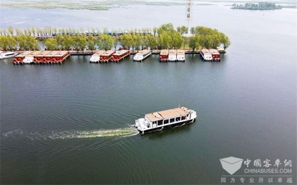 这些船就是由北京公交集团独家运营的白洋淀“水上巴士”,能串联起白洋淀的多个景区,相较于传统的燃油船舶,采用清洁能源更加绿色环保,能有效减排温室气体50%以上,有害颗粒物排放降低95%以上。