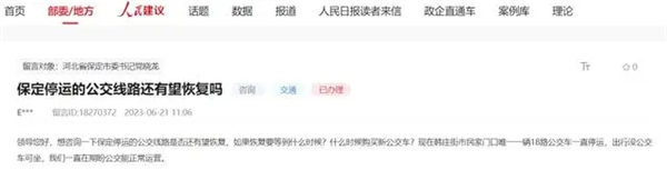 日前,有保定市民通过人民网领导留言板向河北保定市委书记党晓龙咨询:“保定停运的公交线路是否还有望恢复,如果恢复要等到什么时候?”