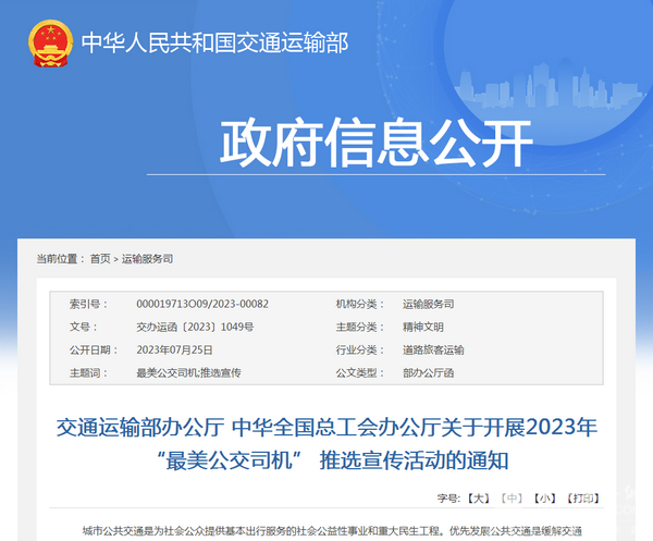交通运输部:关于开展2023年“最美公交司机” 推选宣传活动的通知