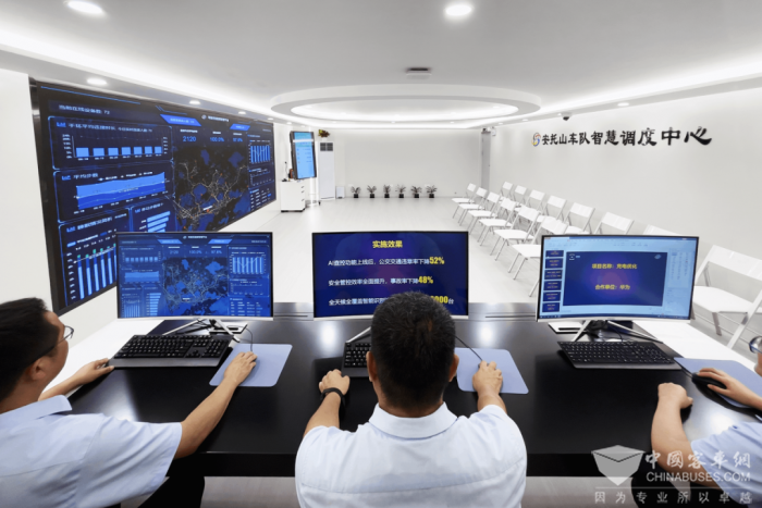 除“新能源”,“智慧化”是安托山场站更显著的一个“标签”。在场站智能调度中心的调度大屏上,可展示车队核心可视化数据平台及业务系统,利用大数据、AI算法及5G通信等技术,实现了车队核心调度业务的精细化管理,打造出一个“全天候、全方位、全流程”的综合调度管理运营监测体系。