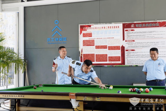白天安托山场站主要开放给社会车辆进行充电。在位于场站入口的办公楼1楼党群活动中心,专门打造了一个供司机们等候充电的休闲区,里面还非常人性化地设置了桌椅、阅读区、多媒体播放屏,以及乒乓球台、桌球台等。司机们可以一边轻松地休息或是娱乐,一边等候自己的车充好电。由于场站内快充电桩多,普通私家车一般充电速度很快,充满一次仅需1个多小时,用司机们常说的话便是:“喝杯茶的功夫,电就充好了,可以‘满格’再出发!”