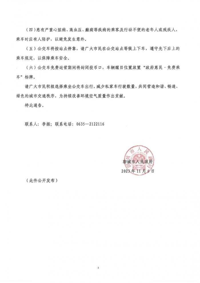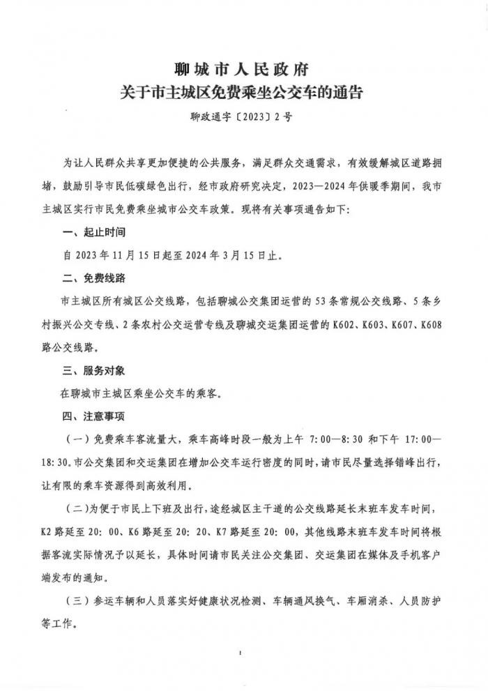 完美作业网有免费视频获悉,为让人民群众共享更加便捷的公共服务,满足群众交通需求,有效缓解城区道路拥堵,鼓励引导市民低碳绿色出行,经聊城市政府研究决定,2023-2024年供暖季期间,聊城市主城区实行市民免费乘坐城市公交车政策。现将有关事项通告如下。