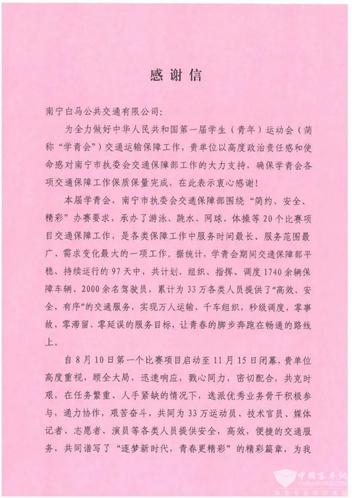 确保各项交通保障工作顺利完成 南宁白马公交喜获学青会感谢信