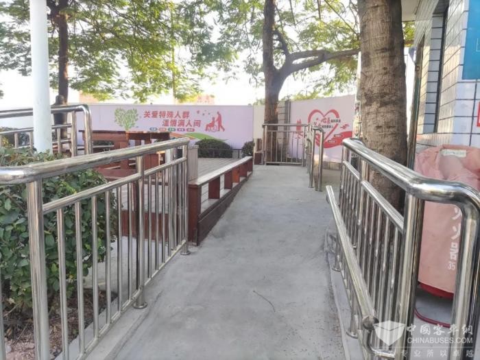 在改造候车休息区的同时,增设了无障碍通行坡道、安全护栏及扶手,沿着候车休息区无障碍通行坡道,通过场站内斑马线可连接场站内原有的无障碍通行坡道直达特殊群体上客区。