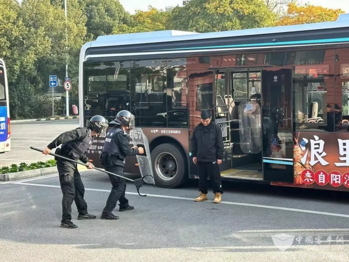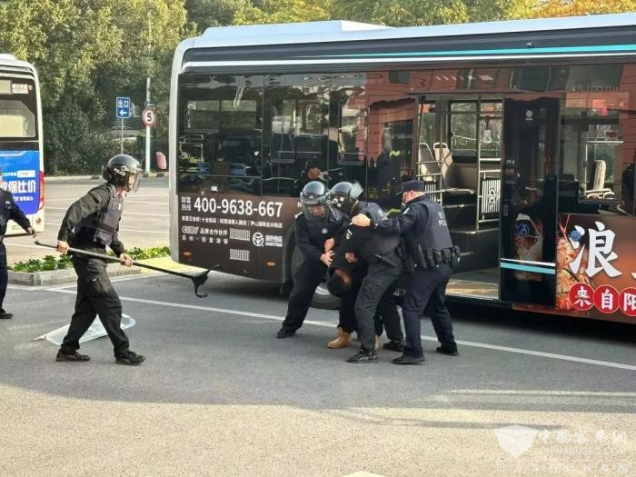 本次演练是模拟一名乘客携带易燃易爆物品及管制刀具乘车。演练现场,当驾驶员发现上车乘客疑似携带易燃易爆物品,立即警觉并随即再确认,随后告知其禁止乘车。该乘客态度强硬拒绝下车,并语言攻击驾驶员。此时乘客情绪激动,反应进一步过激,驾驶员立即使用“一键报警”系统。很快,公安特警到达现场,控制并带走了该乘客。
