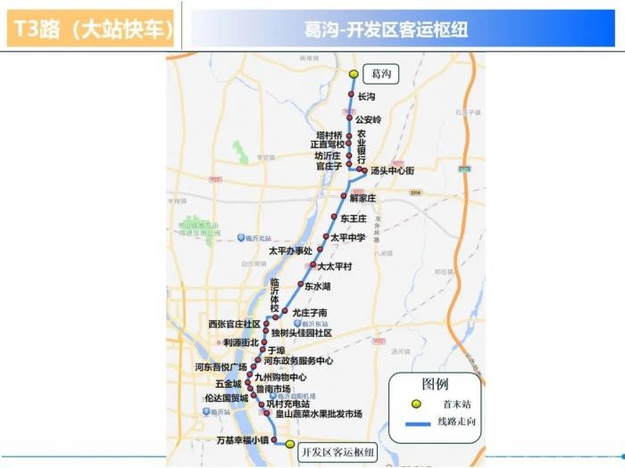 停靠站点(32处):葛沟、长沟、公安岭、塔桥村、正直驾校、坊沂庄、官庄子、农业银行、汤头中心街、解家庄、东王庄、太平中学、太平办事处、大太平村、东水湖、尤庄子南、临沂体校、西张官庄社区、独树头佳园社区、利源街北、于埠、河东区政务服务中心、河东吾悦广场、凤凰大街路口、九州购物中心(单边)、五金城、鲁南市场、伦达国贸城、巩村充电站、皇山蔬菜水果批发市场、万基幸福小镇、开发区客运枢纽。