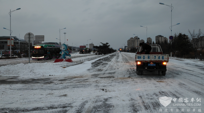 各车队值班人员如遇雪天第一时间派遣清雪车辆对公交车线路重点路段、乘车站点路面进行清扫、洒融雪剂,确保公交车辆正常运营的同时保证乘客出行安全畅通。