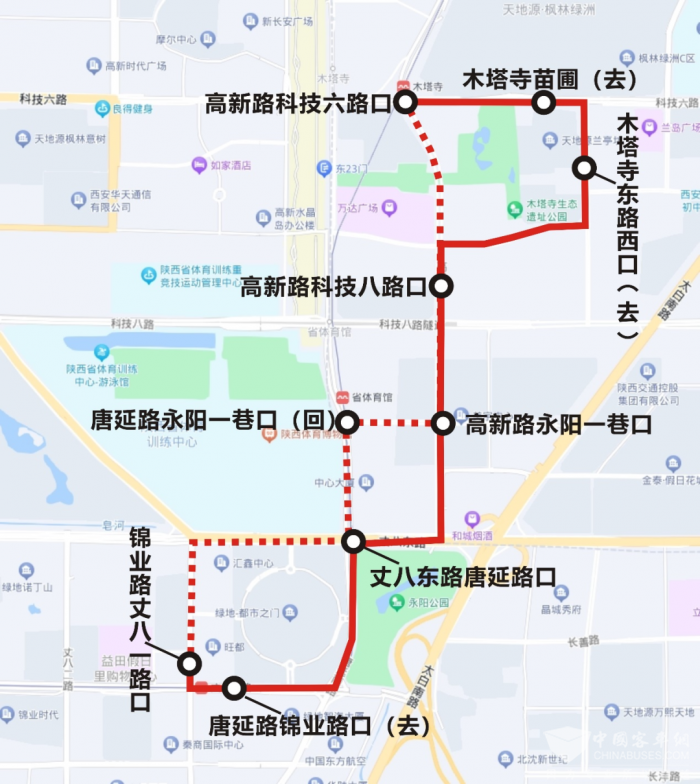 线路设置站点9个:高新路科技六路口、木塔寺苗圃(去)、木塔寺东路西口(去)、高新路科技八路口、高新路永阳一巷口、唐延路永阳一巷口(回)、丈八东路唐延路口、唐延路锦业路口(去)、锦业路丈八一路口。