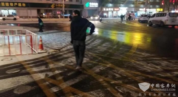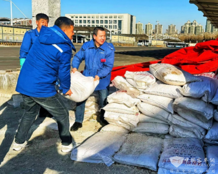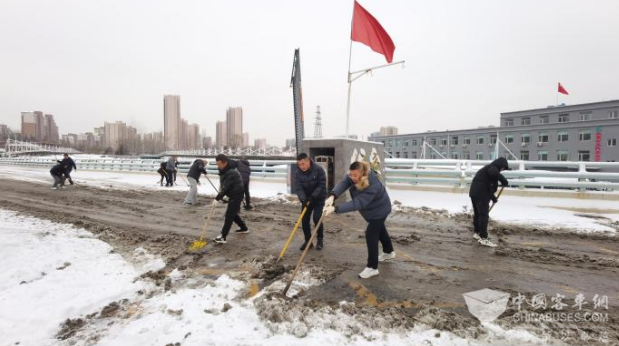 由于来往车辆多,积雪被碾压过后路面很快结冰,雪情就是命令,各分公司积极组织机关各科室及各车队干部、管理人员投入到清障工作中来。大家分工明确,有的负责停车场积雪清扫与车辆除雪,有的在公交车辆沿线站台进行积雪清障,有的走上街头播撒融雪剂。
