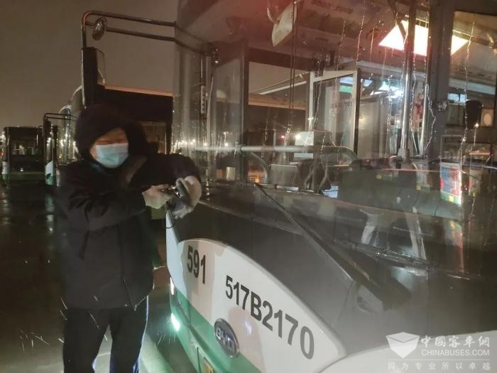 16日清晨6时,在649路黄金口公交停车场,线路主管孙思正在协助驾驶员做好车辆“十检”工作,并准备跟头班车查看路面情况。线路还采取一系列防滑、防冰冻措施,草垫、盐、防冻液等物资齐全,以备不时之需。
