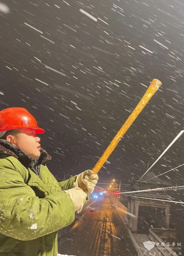12月16日凌晨,武汉公交七公司供电所及时组织工程车加强夜间线网巡查工作,发现线网有结冰现象就实施“敲冰”作业,确保电车线路在寒潮天气能顺利开班,护航市民温暖出行。公司营运部根据冰雪天气特点,灵活调度,及时调整行车作业计划,重点线路适时增加发车频次,科学调配运力,减少市民候车时间;还充分发挥智能调度系统作用,科学调度营运车辆,最大程度全力“温暖”市民出行需求,用温暖和坚守保障市民乘客的安全出行。