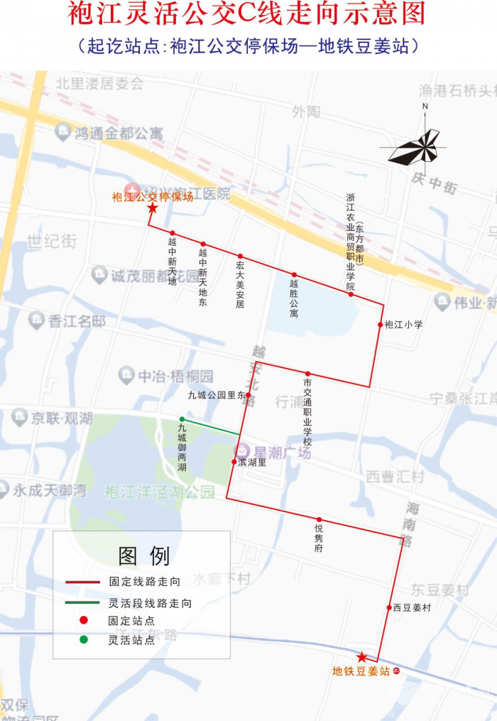 袍江灵活公交C线从袍江公交停保场始发,途经越王路、世纪街、越英路、育贤路、越安路、安城路、海南路、洋江路至地铁豆姜站,沿途停靠11个固定公交站点,设有“九城御两湖”灵活站点,串联袍江医院、浙江农业商贸职业学院、袍江小学、市交通职业学校、豆姜地铁站等出行热点;发车时间为袍江公交停保场6:30-8:15、16:45-17:45,地铁豆姜站6:50-8:15、16:50-18:00,发车间隔15分钟。