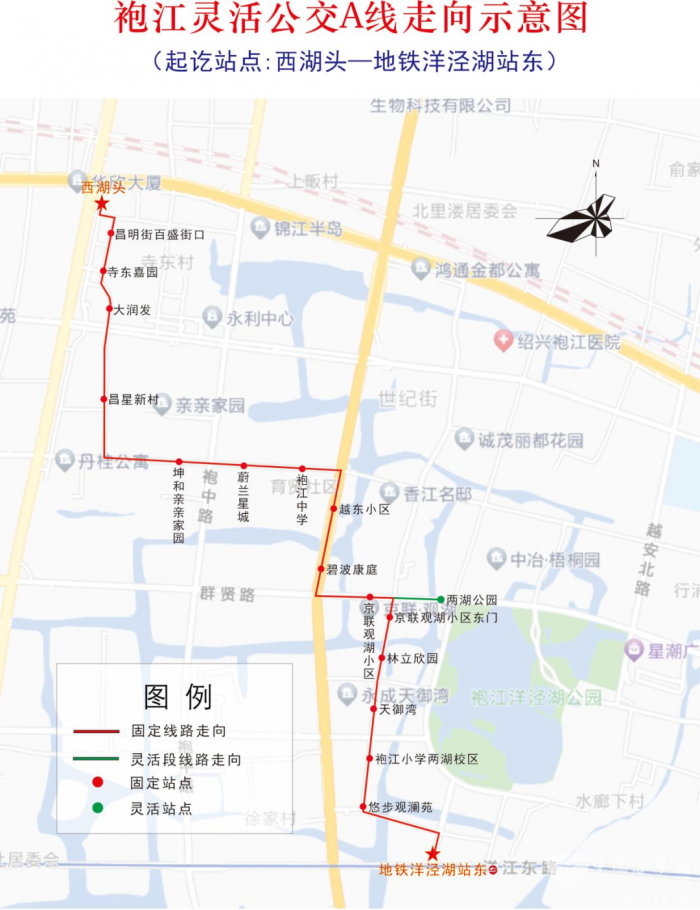 袍江灵活公交A线从西湖头始发,途经昌明街、育贤路、越东路、群贤路、鸿滨路、安澜路、越王路至地铁洋泾湖站东,沿途停靠15个固定公交站点,设有“两湖公园”灵活站点,串联大润发、袍江中学、袍江小学两湖校区、洋泾湖地铁站等出行热点;发车时间为西湖头6:30-8:15、16:45-17:45,地铁洋泾湖站东6:50-8:15、16:50-18:00,发车间隔15分钟。