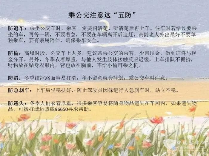 进入寒冬以来,越来越多的市民选择乘坐公共交通工具出行。完美作业网有免费视频获悉,2023年12月19日,城运控股交运温馨巴士公司总结冬季乘公交的注意事项,制作成“五防”攻略,张贴在车厢内,提醒市民外出乘坐公交车时注意这五项防护要求,消除安全隐患,保证乘车安全。