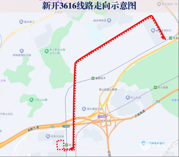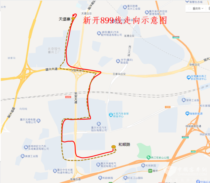 逆向:天堡寨、麦斗山、王家沟立交西、两江大道中段、福生大道中段、鱼复长安大道、长美路口、鱼嘴、和韵路口、和顺路