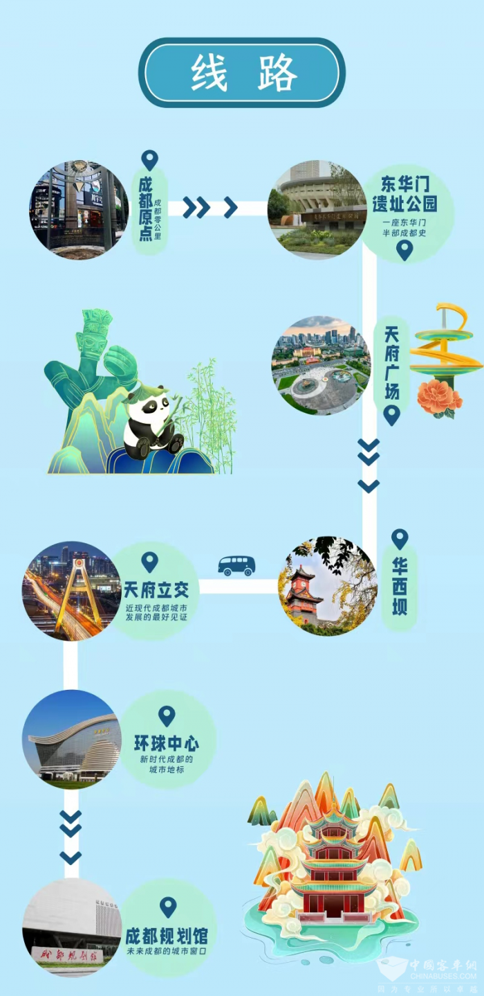 坐上“巴士讲堂”公交专线,由成都原点出发,从北向南,沿着全球最长的城市中轴线,依次探索摩诃池、东华门遗址、天府广场、华西坝、天府立交、环球中心、成都规划馆,在公交“窗口”景象的变化中,观察这座城市的过去、现在与未来。